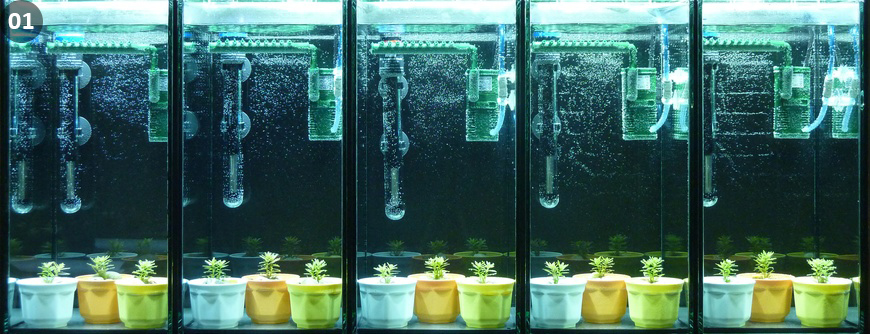 Thử nghiệm trên dàn hồ gồm 5 hồ kích thước 20cm x 20cm x 40cm (dài rộng cao), dung tích 16 lít. Mỗi hồ đều có 1 lọc treo KHÔNG có vật liệu lọc bên trong, mục đích là để hạn chế tối đa khả năng vật liệu lọc ảnh hưởng đến nồng độ dinh dưỡng đưa vào, lọc treo này có nhiệm vụ luân chuyển nước, tạo dòng, luân chuyển co2… Mỗi hồ đều có nhiệt kế theo dõi. Trong mỗi hồ đều có 3 chậu nhựa nhỏ để trồng cây, được đổ đầy bằng nền cát trơ có đường kính 0.7 đến 1.2mm. Mục đích dùng nền trơ để tính toán chính xác lượng dinh dưỡng cung cấp, khi dùng nền có dinh dưỡng thì việc tính toán là không thể.